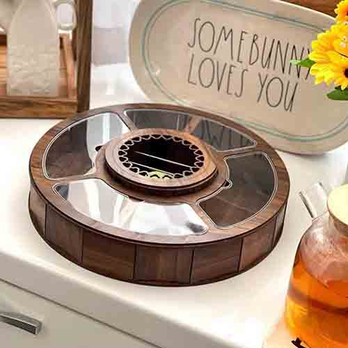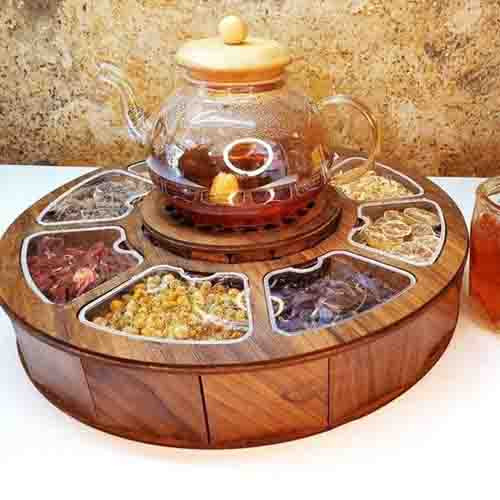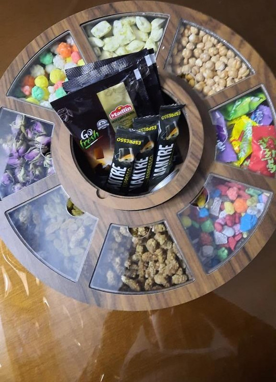 - طراحی گرد با 6 خانه: هر یک از خانهها مختص به نگهداری انواع دمنوش، نبات، شکلات یا تنقلات است.