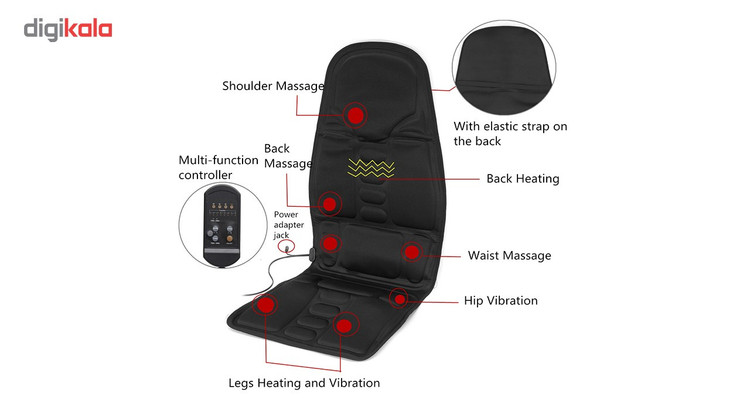 دارای 5 موتور بسیار قوی ، قابلیت ماساژ چندین نقطه به طور همزمان ، قابل اتصال به شارژ فندکی خودرو و برق شهری ، گرم کردن پشت کمر در فصل زمستان ، قابل استفاده روی صندلی ماشین و منزل و محل کار ، رفع خستگی عضلات ناحیه مورد ماساژ ، آرامش در بدن و شل کردن عضلات پشت ، سرعت بخشیدن به فرایند خون رسانی در رانندگی های طولانی ، دارای هشت برنامه ماساژ مجزا ، دارای ریموت کنترل |