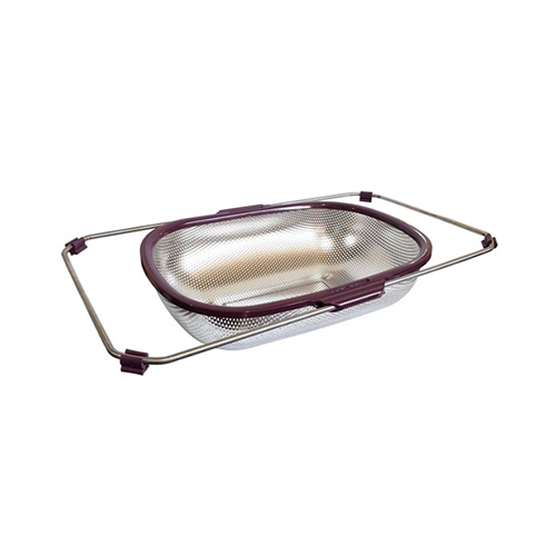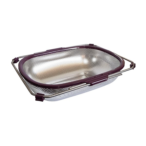 این سبد به شکل بیضی طراحی شده و دارای دو دسته کشویی است که میتوان آنها را بر اساس عرض سینک باز یا بسته کرد. دستهها دارای روکش سیلیکونی ضد لیز هستند و با فشار کمی قفل میشوند و از باز شدن ناگهانی یا تکان خوردن جلوگیری میکنند.