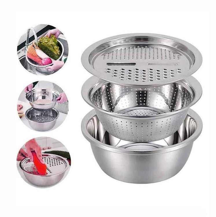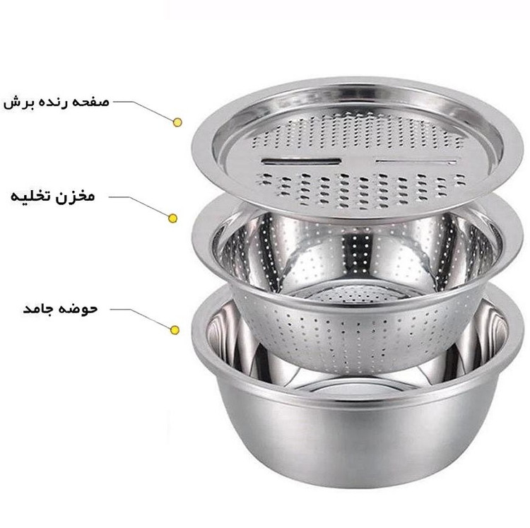 طراحی هوشمندانه و کمجا: مهمترین ویژگی این ست، طراحی هوشمندانه و تودرتوی آن است. لگن، آبکش و رنده به شکلی دقیق و مهندسیشده ساخته شدهاند که کاملاً روی هم قرار میگیرند. این بدان معناست که شما مجموعهای ازابزار آشپزخانه ضروری را در اختیار دارید که تنها به اندازه یک کاسه فضا اشغال میکند! با کابینتهای شلوغ و نامرتب خداحافظی کنید و از نظم ایجاد شده لذت ببرید.ابعاد ایدهآل: قطر هر سه قطعه این ست 30 سانتیمتر است. این اندازه استاندارد و کاربردی، آن را برای مصارف گوناگون خانگی، از شستشوی مقدار زیادی میوه و سبزی گرفته تا آمادهسازی مواد اولیه برای غذاهای مختلف، کاملاً مناسب میسازد.رنده چندکاره: رنده این مجموعه یک ابزار شگفتانگیز و کارآمد است. سطح رنده به صورت هوشمندانهای با یک خط میانی به دو بخش اصلی تقسیم شده: یک قسمت برایرنده کردن ریز (ایدهآل برای سیر، زنجبیل، پوست مرکبات، پنیرهای سخت مانند پارمزان) و سمت دیگر برایرنده کردن درشت (عالی برای سیبزمینی، هویج، کدو، پیاز، پنیر پیتزا). خط میانی نیز به عنوانورقه کن (اسلایسر) عمل کرده و برای تهیه چیپسهای نازک سیبزمینی یا ورقههای خیار و کدو برای سالاد و تزئین غذا فوقالعاده است. طراحی لبههای رنده به گونهای است که مواد رنده شده به راحتی به داخل آبکش یا لگن هدایت شده و از پاشیدن آنها به اطراف جلوگیری میکند.کارایی ترکیبی و جداگانه: جذابیت این ست در انعطافپذیری استفاده از آن است. شما میتوانید هر سه قطعه را روی هم قرار داده و به طور همزمان از آنها استفاده کنید. به عنوان مثال، برای تهیه کتلت یا کوکو، سیبزمینی و پیاز را مستقیماً روی رنده که بر روی آبکش و لگن قرار دارد، رنده کنید. مواد رنده شده داخل آبکش جمع شده و آب اضافی آنها بلافاصله به داخل لگن زیرین میچکد. این فرآیند بدون نیاز به ظروف اضافی و با کمترین ریختوپاش انجام میشود. همچنین میتوانید از لگن و آبکش به صورت جداگانه برای شستشو و آبکشی انواع میوه، سبزیجات، برنج، ماکارونی و حبوبات استفاده کنید.سهولت در استفاده و جابجایی: لبههای هر سه قطعه به شکلی طراحی شدهاند که گرفتن و بلند کردن آنها، حتی زمانی که پر هستند، آسان باشد. وزن ست متعادل بوده و حس کیفیت و استحکام را به خوبی منتقل میکند، در عین حال آنقدر سنگین نیست که جابجایی آن دشوار باشد.دوام و ماندگاری: جنس استیل مرغوب این ست تضمین میکند که محصول شما در برابر استفاده مکرر و شستشوهای پیاپی مقاوم بوده و سالهای سال کارایی و زیبایی اولیه خود را حفظ کند. این یک سرمایهگذاری هوشمندانه برای آشپزخانه شماست.کاربرد گسترده: علاوه بر آشپزخانههای خانگی، این ست به دلیل دوام بالا، بهداشت و کارایی فوقالعاده، گزینهای عالی برای استفاده در رستورانها، کافهها، فستفودها و آشپزخانههای صنعتی هتلها نیز محسوب میشود.