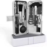 کیت تمیز کننده ۱۹ کاره یک مجموعه کامل از ابزارها و مواد شوینده است که برای تمیز کردن انواع دستگاههای الکترونیکی مانند لپتاپ، گوشی موبایل، تبلت، کیبورد، ماوس و... طراحی شده است. این کیت معمولاً شامل برسهای نرم و سخت، پنبههای الکلی، اسپریهای تمیزکننده، بادگیرها و ابزارهای مخصوص برای دسترسی به نقاط سخت دستگاهها میشود.